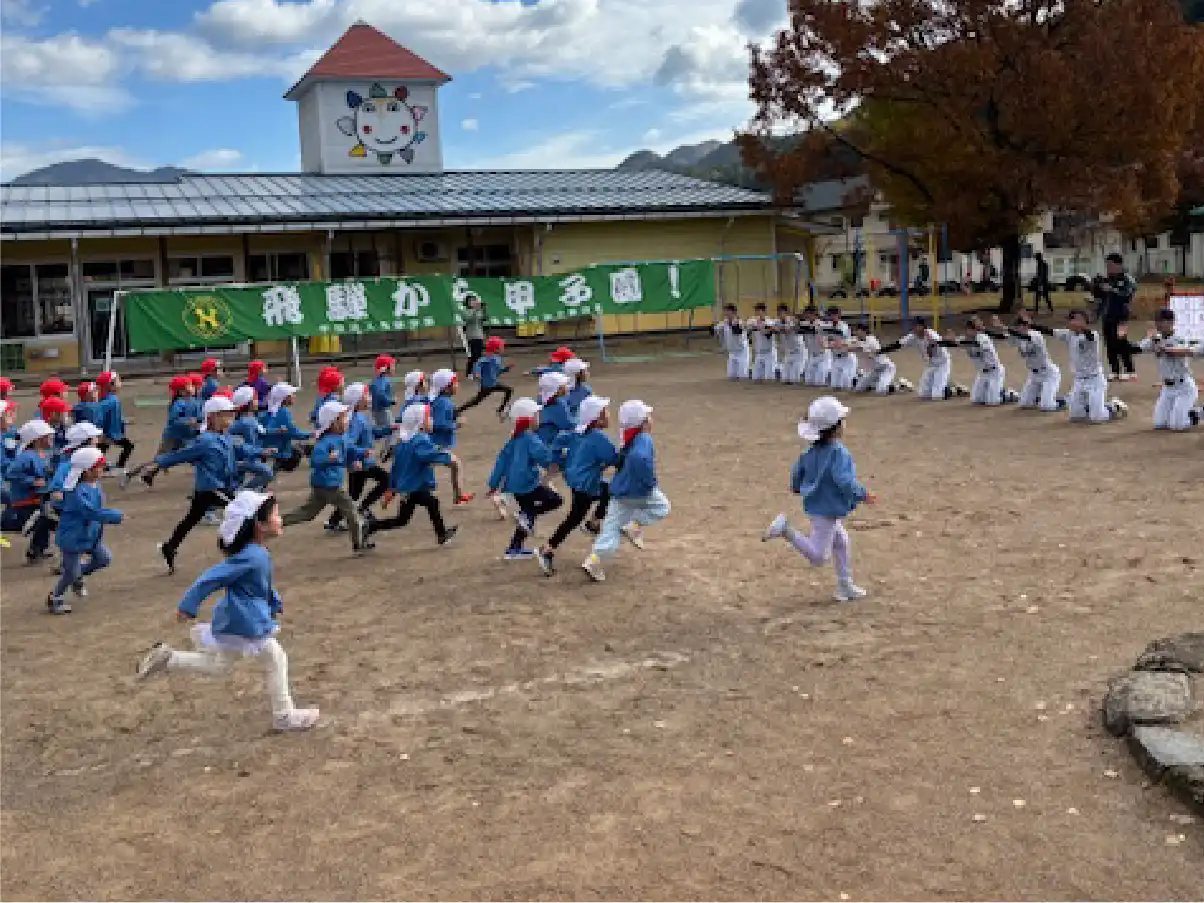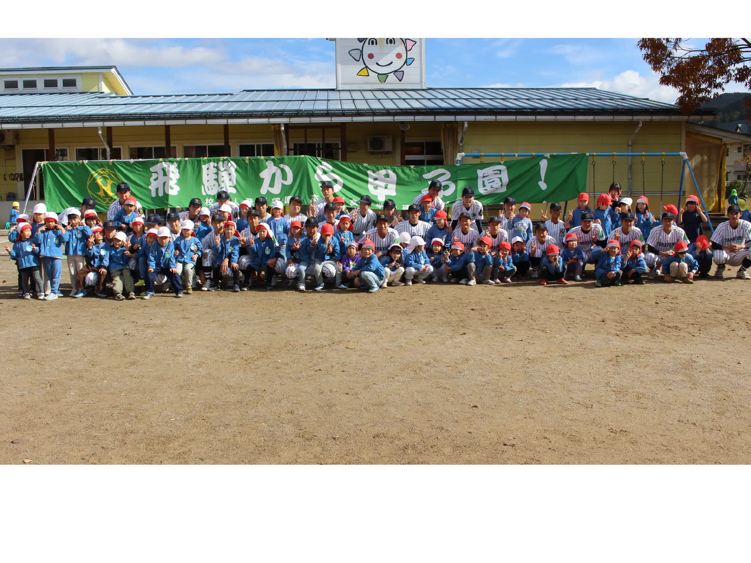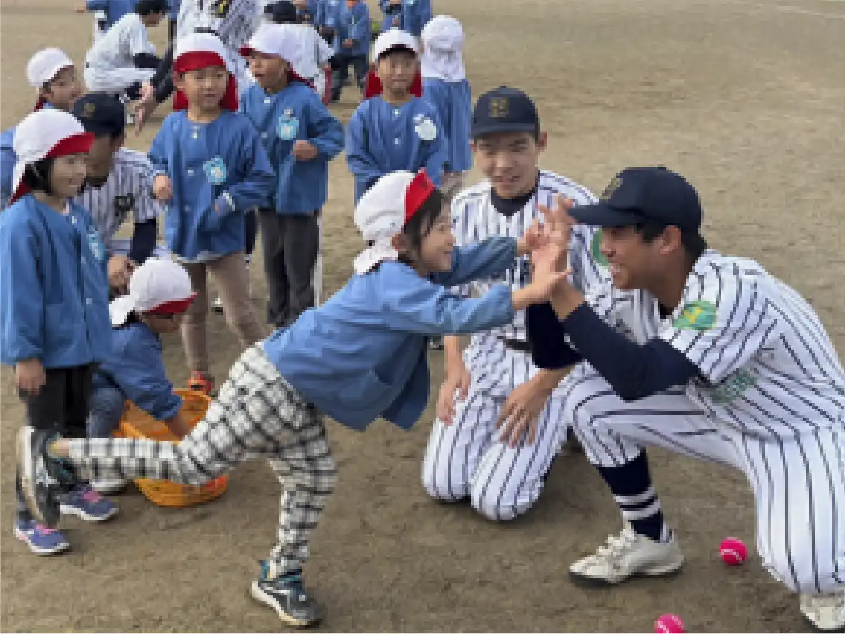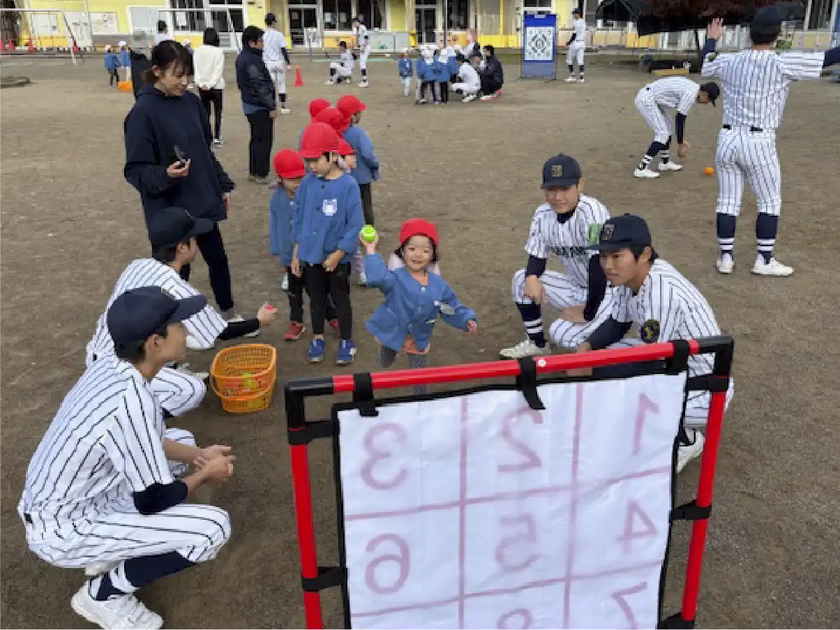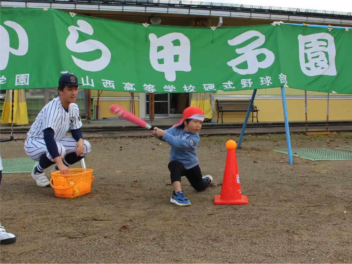 硬式野球部の部員たちは、投球・バッティングの動作を園児の目線に立ち手本を見せることで、ボール遊びの楽しさを伝えました。部員たちは園児を上手に褒めてやる気にさせたり、ハイタッチやたくさんの声掛けをしたりして、会場はとても盛り上がりました。目標とする「飛騨から甲子園!」の実現へ向けて、今回も園児たちの笑顔や声援からたくさんの勇気とパワーをもらいました。