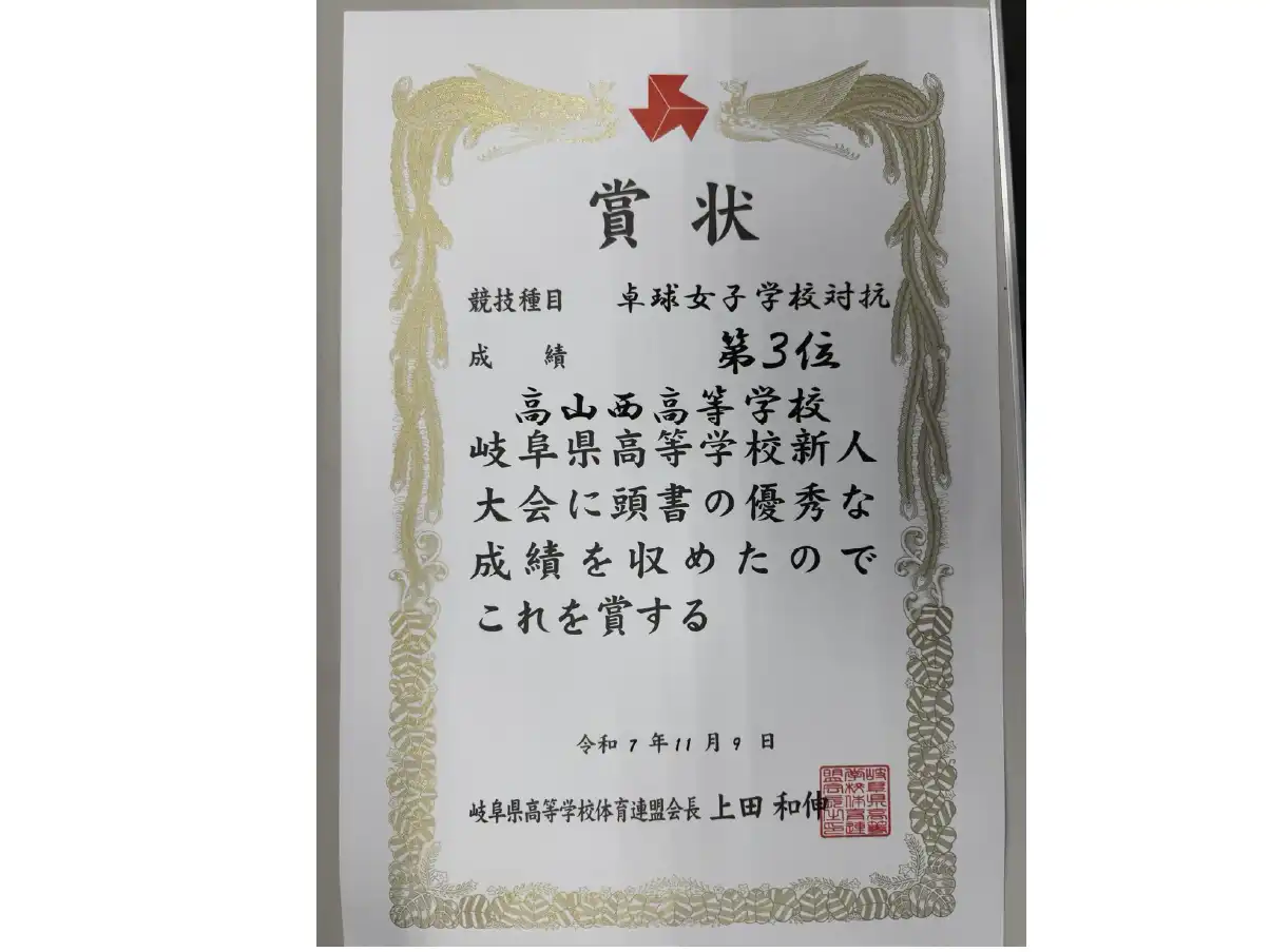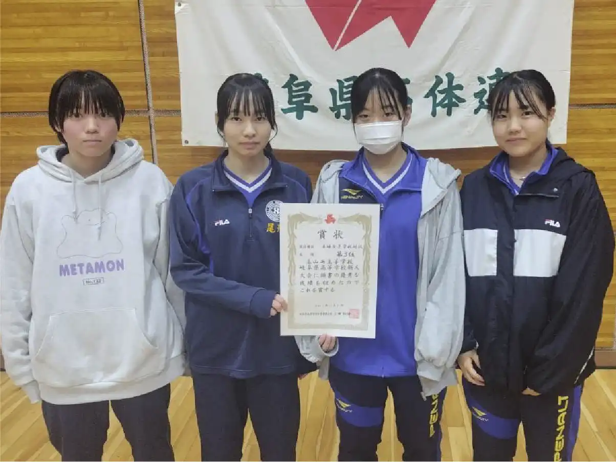 11月8日(土)から9日(日)にかけて、多治見市の「感謝と挑戦のTYK体育館」にて岐阜県高等学校新人卓球大会がおこなわれました。本校は、女子の学校対抗の部で3位入賞を果たしました!今大会に出場した4名は、全員が1年生。今後の成長が楽しみです!