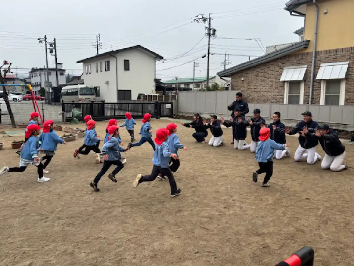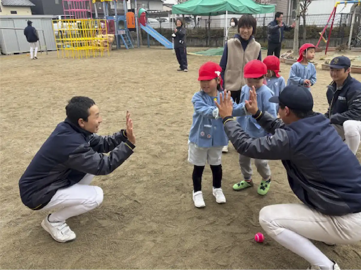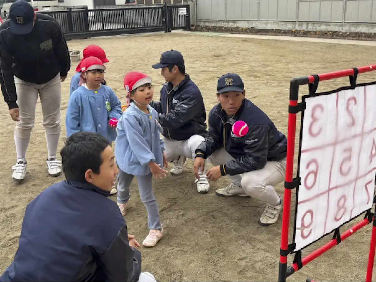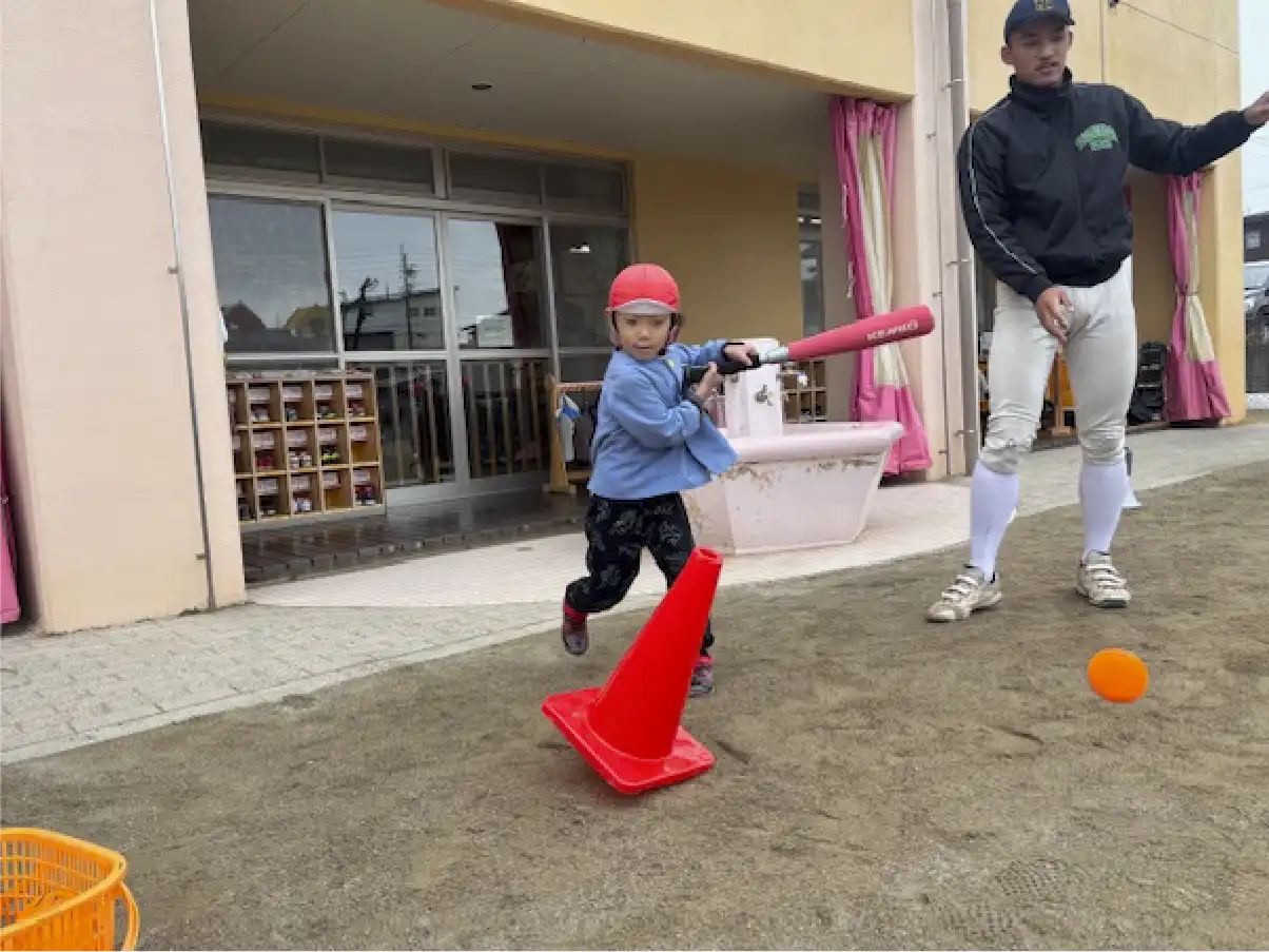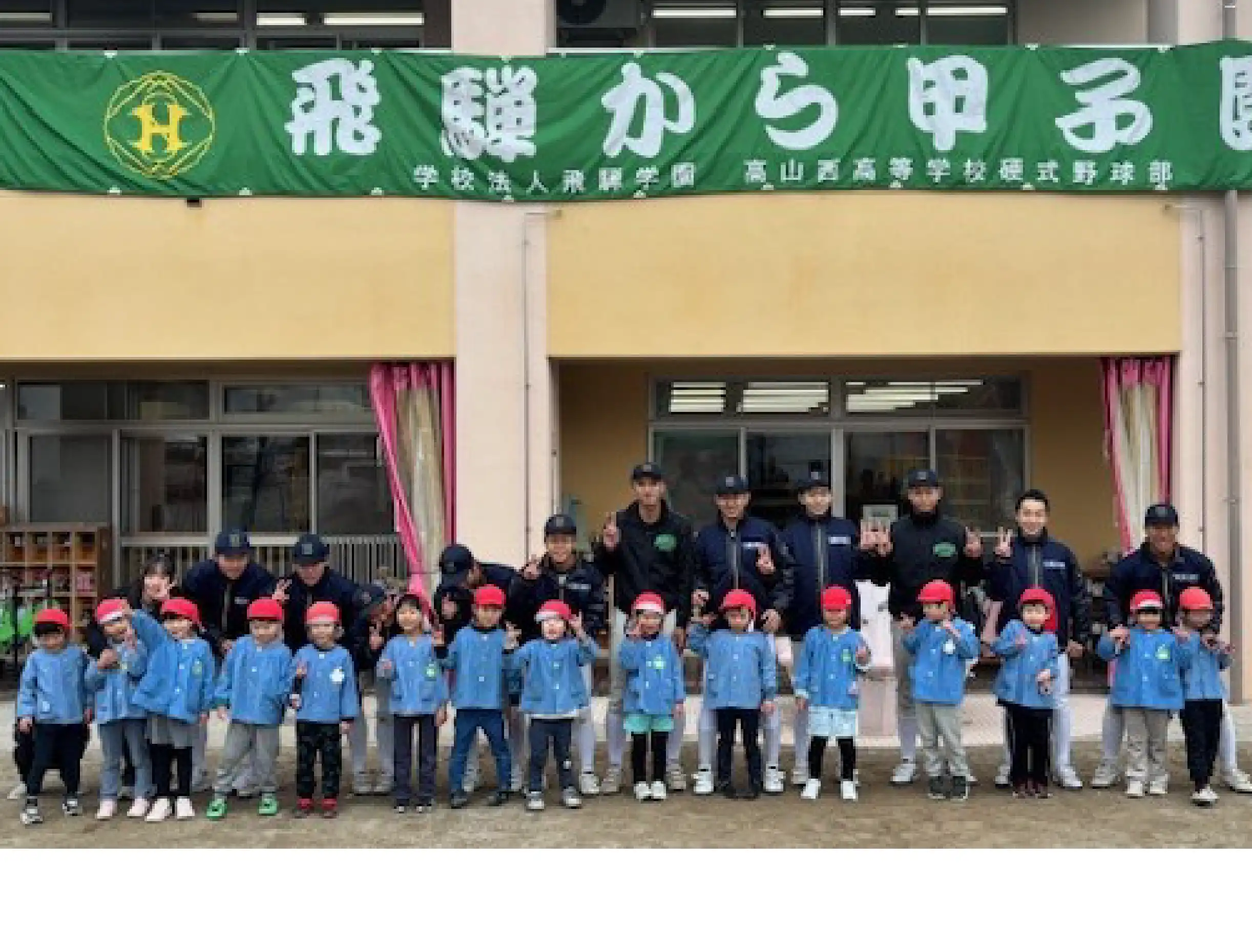 12月2日(火)に硬式野球部が岡本保育園を訪れ、今年3回目となる未就学児対象の「ティーボール教室」を開催しました。選手たちも今回で3回目であり、手慣れた手つきで園児たちに、ボール遊びの楽しさを伝え、野球の基本動作など教えました。寒空のなかでしたが、園児たち、選手たちの歓声で寒さを吹き飛ばす盛り上がりとなりました。目標とする「飛騨から甲子園!」の実現へ向けて、今回も園児たちの笑顔や声援からたくさんの勇気とパワーをもらいました。